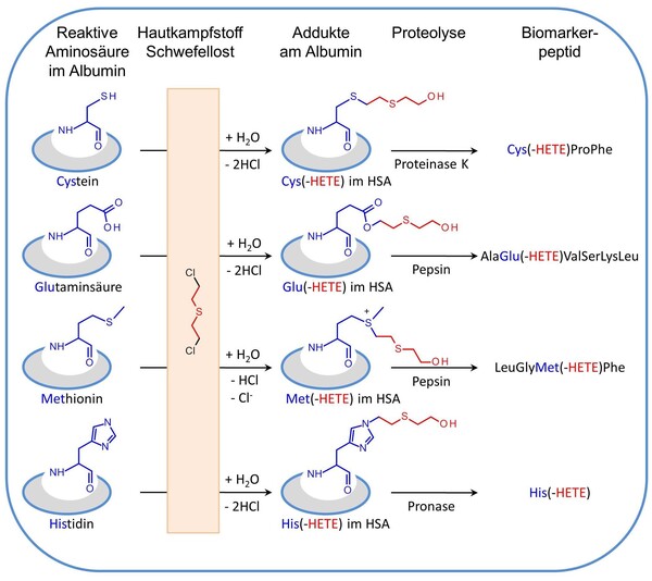 Angriffe auf die Zivilbevölkerung und gezielte Attentate auf Einzelpersonen zeigten in den zurückliegenden Jahren den Schrecken auf, der durch hochgiftige chemische Kampfstoffe (CKS) noch immer verbreitet wird. Trotz Verbotes und internationaler Ächtung durch das Chemiewaffenübereinkommen [1] konnten spezialisierte Labore den Einsatz chemischer Kampfstoffe nachweisen [2-4]. Reaktionsprodukte des humanen Serumalbumins (HSA) spielten dabei eine zentrale Rolle.