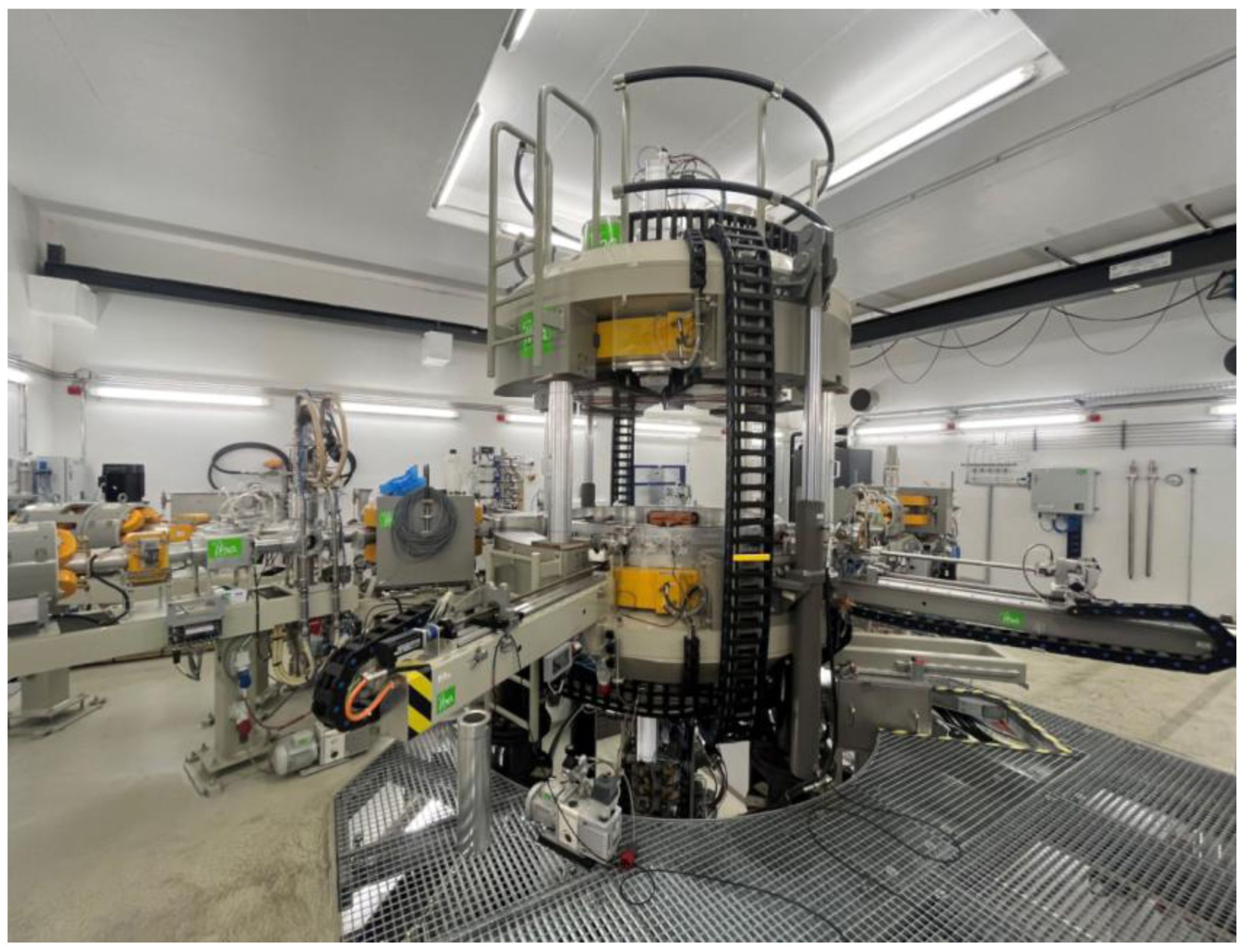 Weil die enthaltenen Radionuklide schnell zerfallen, lassen sich Radiopharmaka nicht „auf Vorrat“ herstellen und Kliniken können lediglich die nicht-radioaktiven Komponenten lagern. Die Radionuklide werden meist unmittelbar vor der Anwendung produziert, wofür komplexe Anlagen wie Teilchenbeschleuniger (sogenannte Zyklotrone) erforderlich sind (Abb. 3a-c).